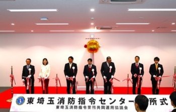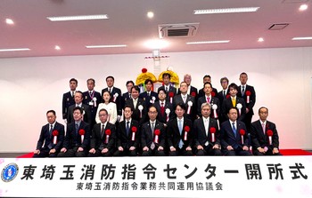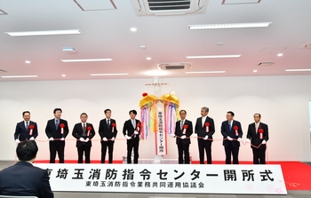 当日は、大野埼玉県知事や構成市町の議長、各関係消防長にもご出席いただき、くす玉開披をはじめ、指令センター紹介動画の放映や内覧会など、盛大な式典となりました。