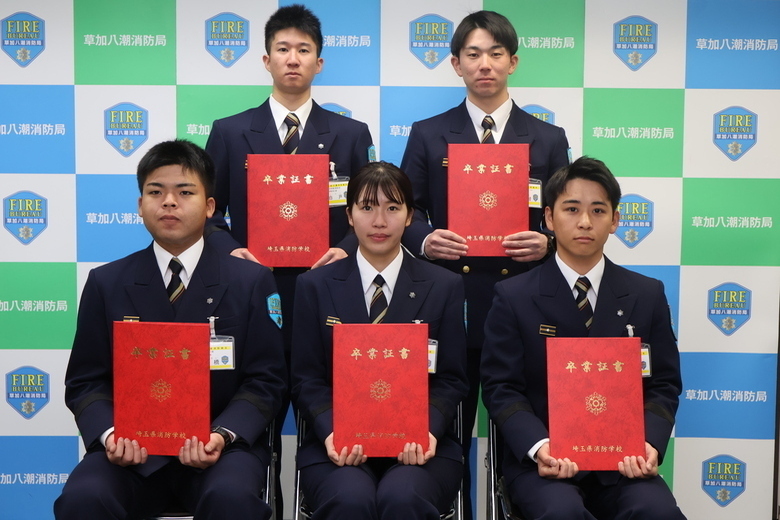 令和8年3月19日(木曜日)、埼玉県消防学校第152期初任教育を修了した5名が、消防局長へ修了申告を行いました。